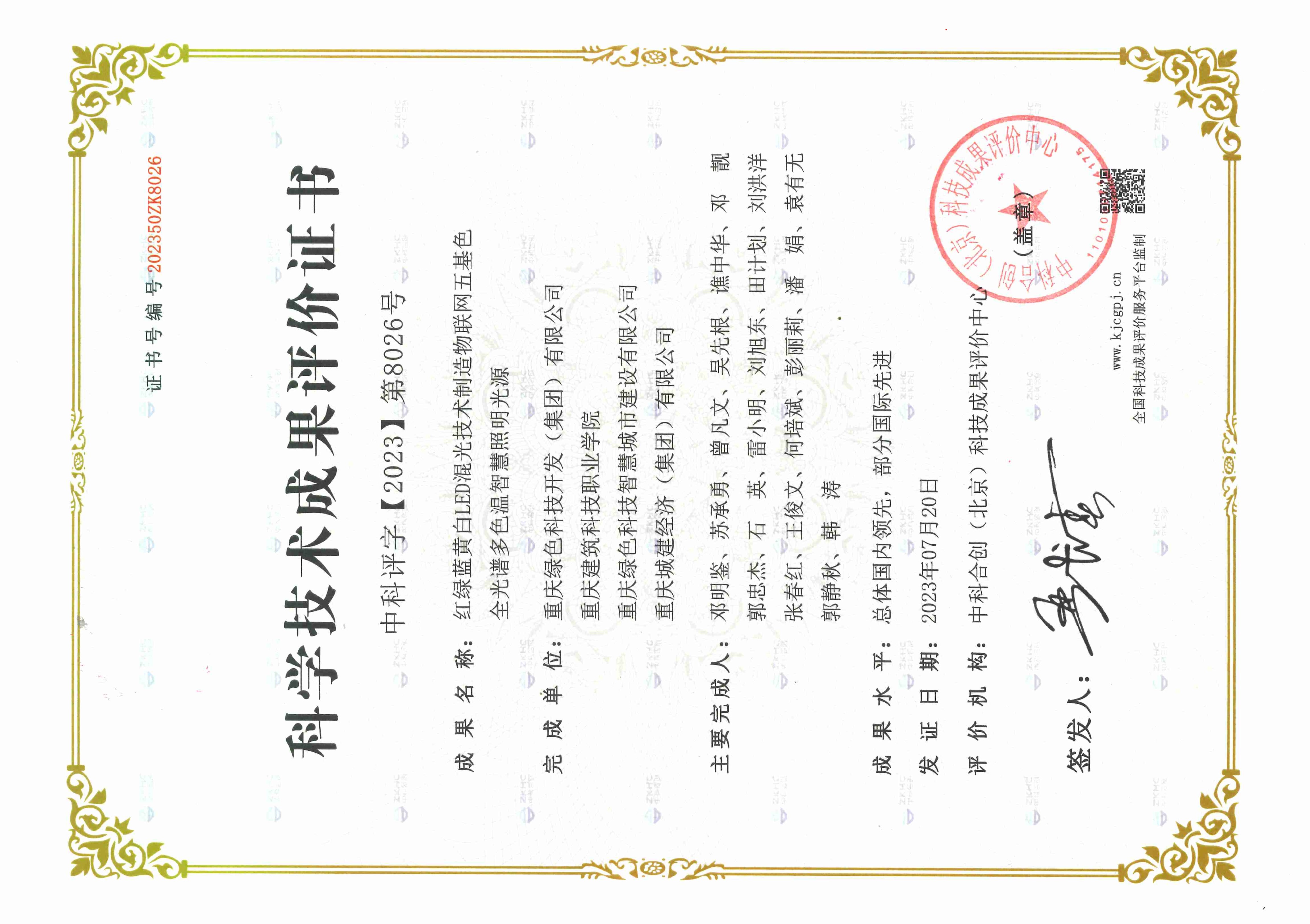 2023年7月11日,中科合創(chuàng)(北京)科技成果評價中心組織專家,在北京對我司“紅綠藍(lán)黃白LED混光技術(shù)制造物聯(lián)網(wǎng)五基色全光譜多色溫智慧照明光源”項目進(jìn)行了科技成果評價。